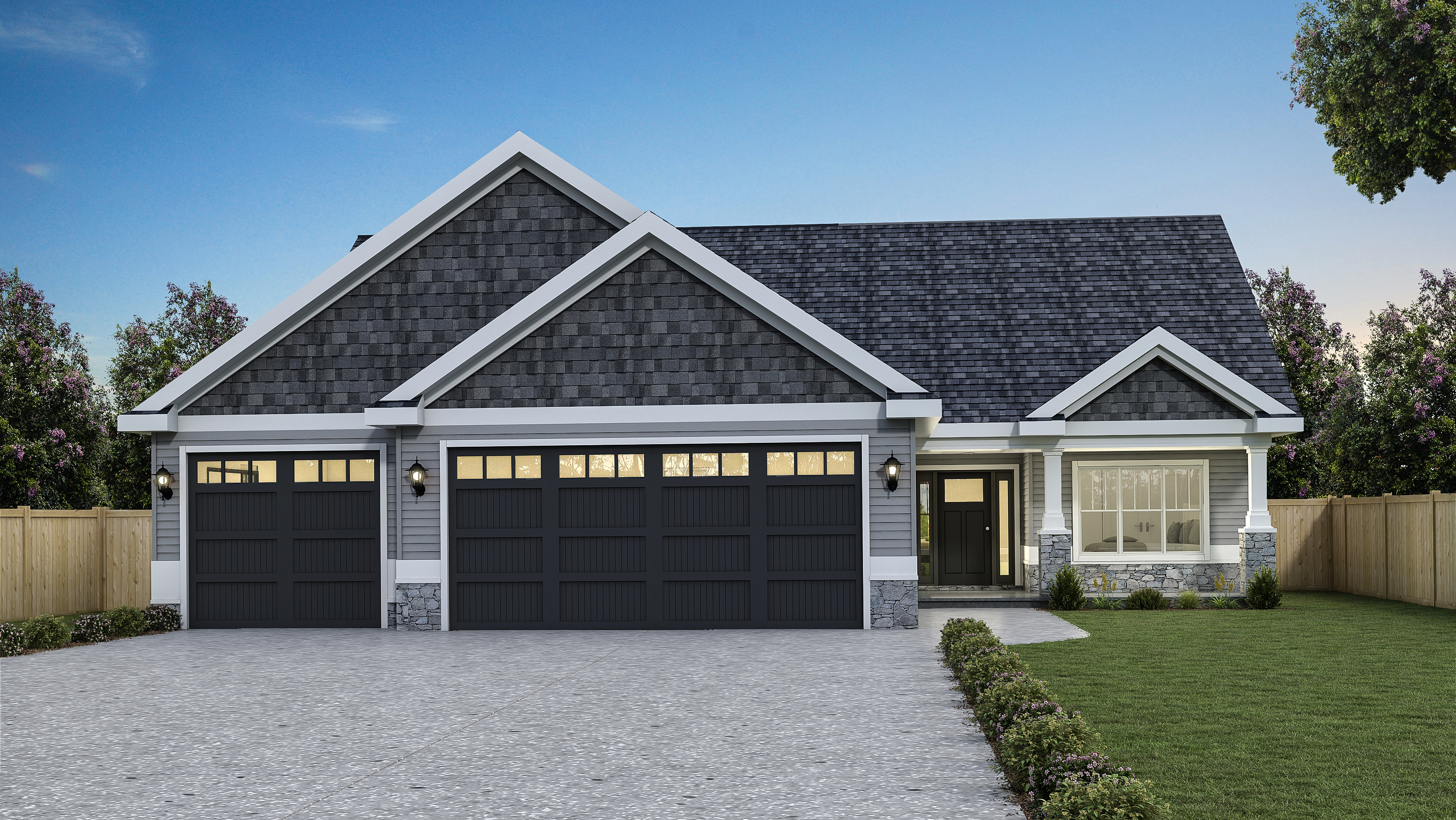 A gorgeous ranch style home with a 3 car garage, 3 bedrooms, 2 full bathrooms, and a covered porch. This home features a large patio and has the option to add 945 sq ft of finished space in the basement adding 2 more bedrooms and another full bath.